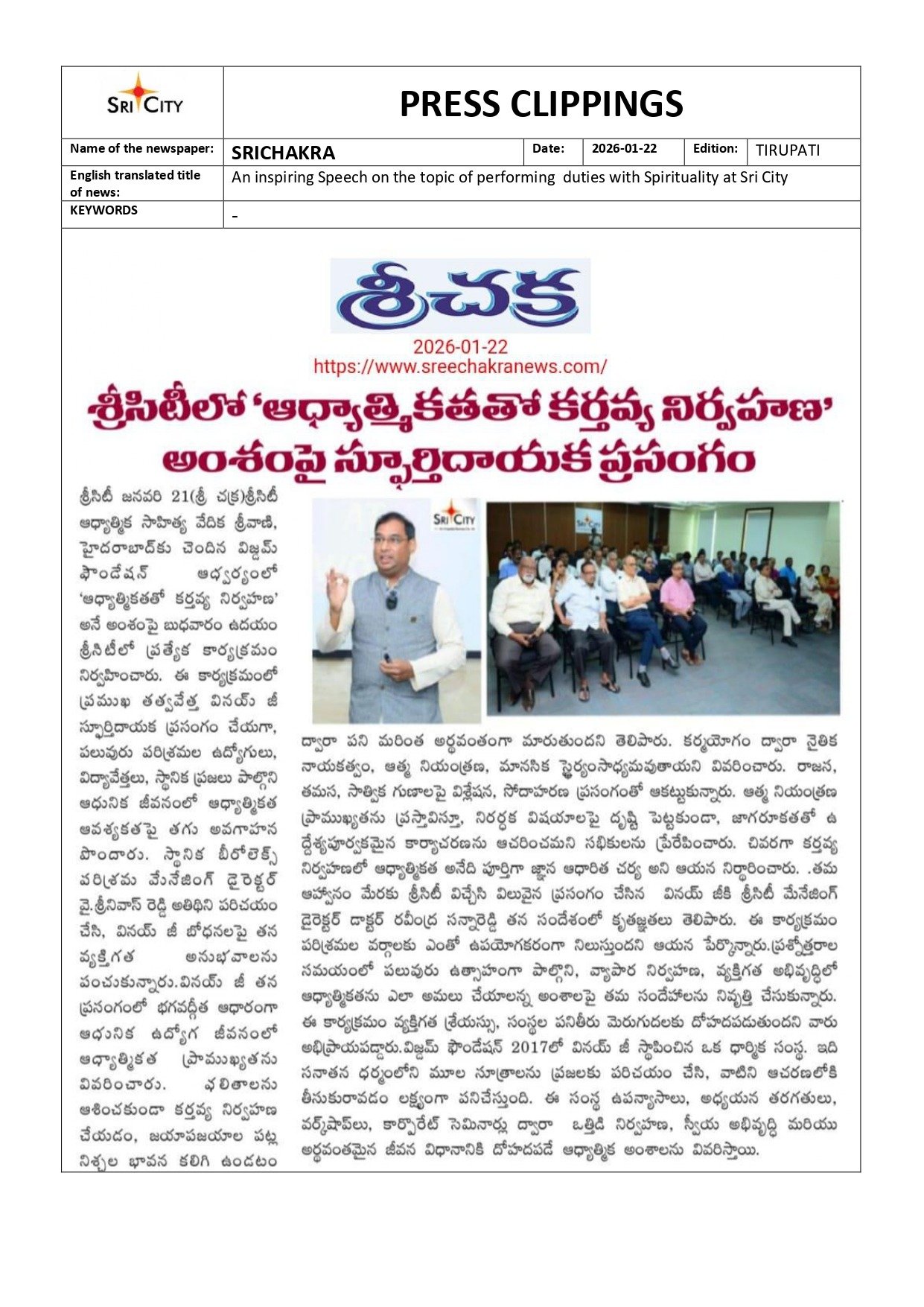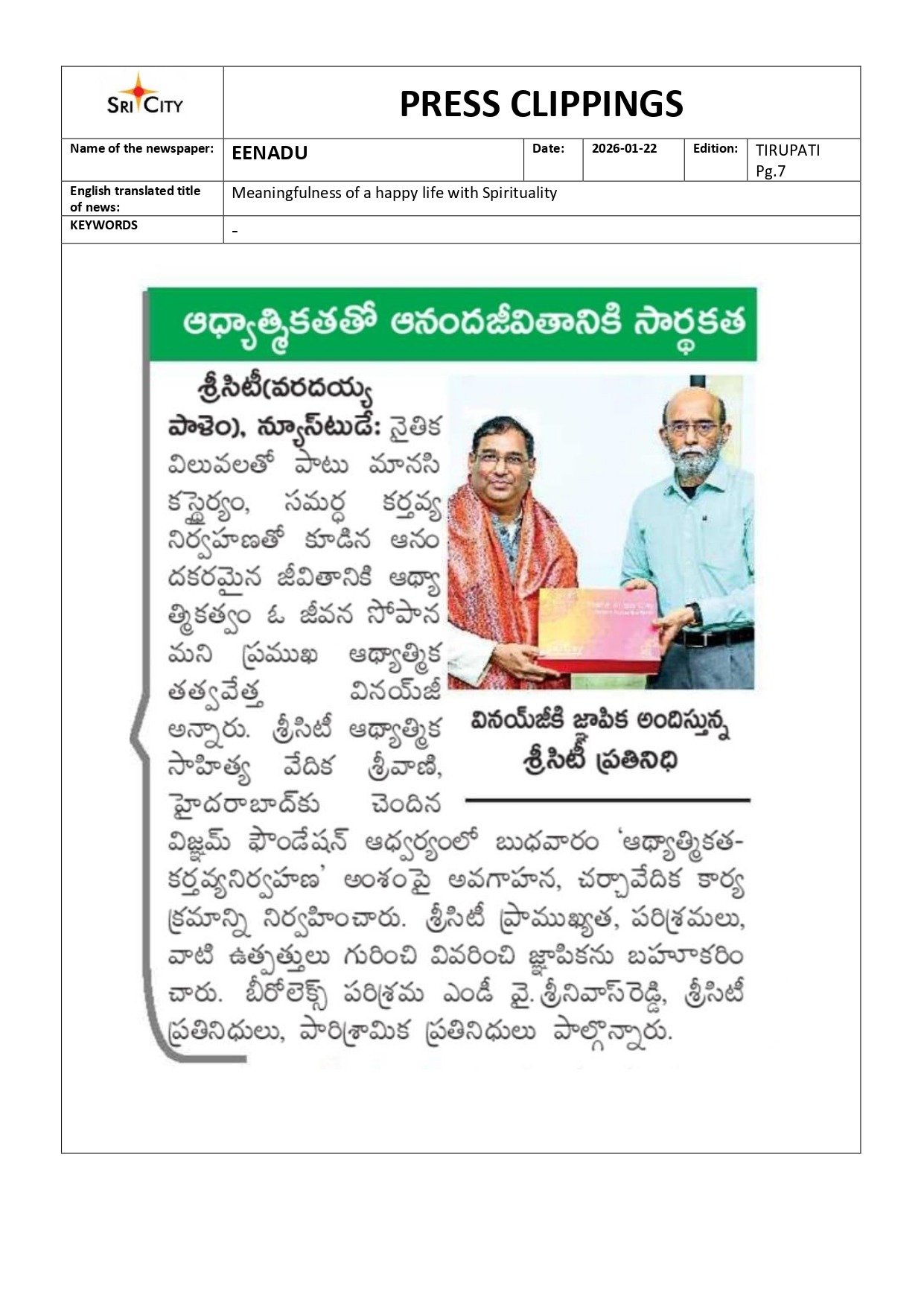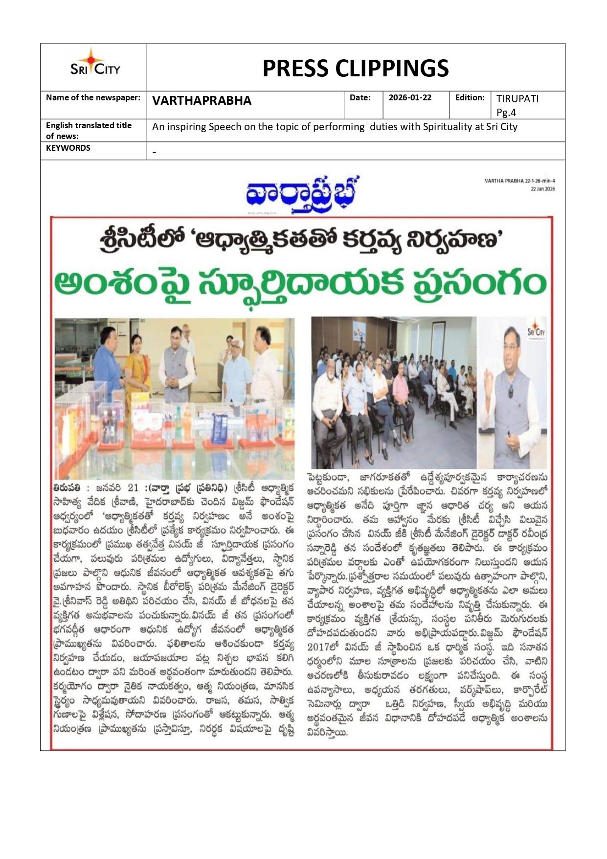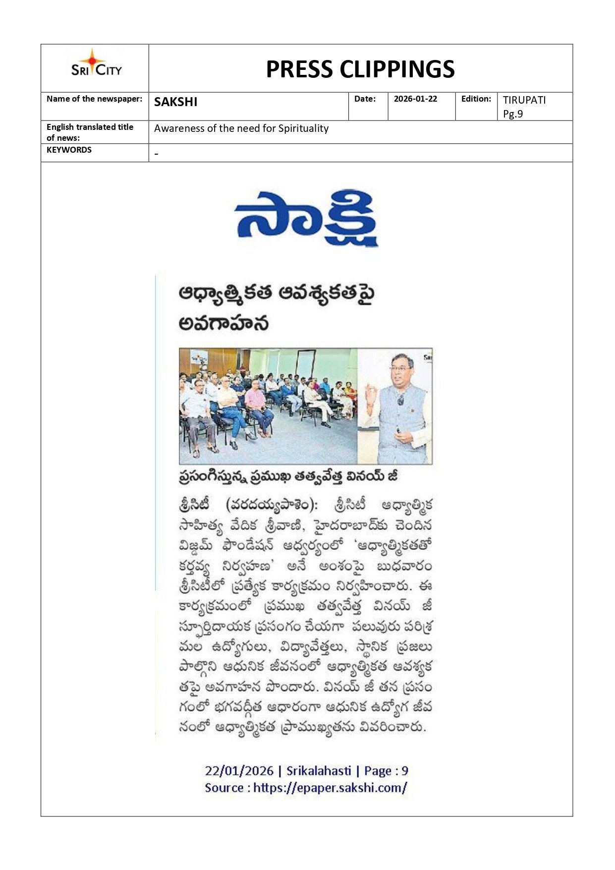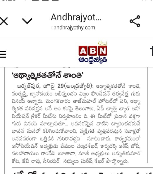 The Telangana & Andhra Pradesh Tax Bar Association – Address by Vinayji on 26th July 2025 on Spirituality at Work.
