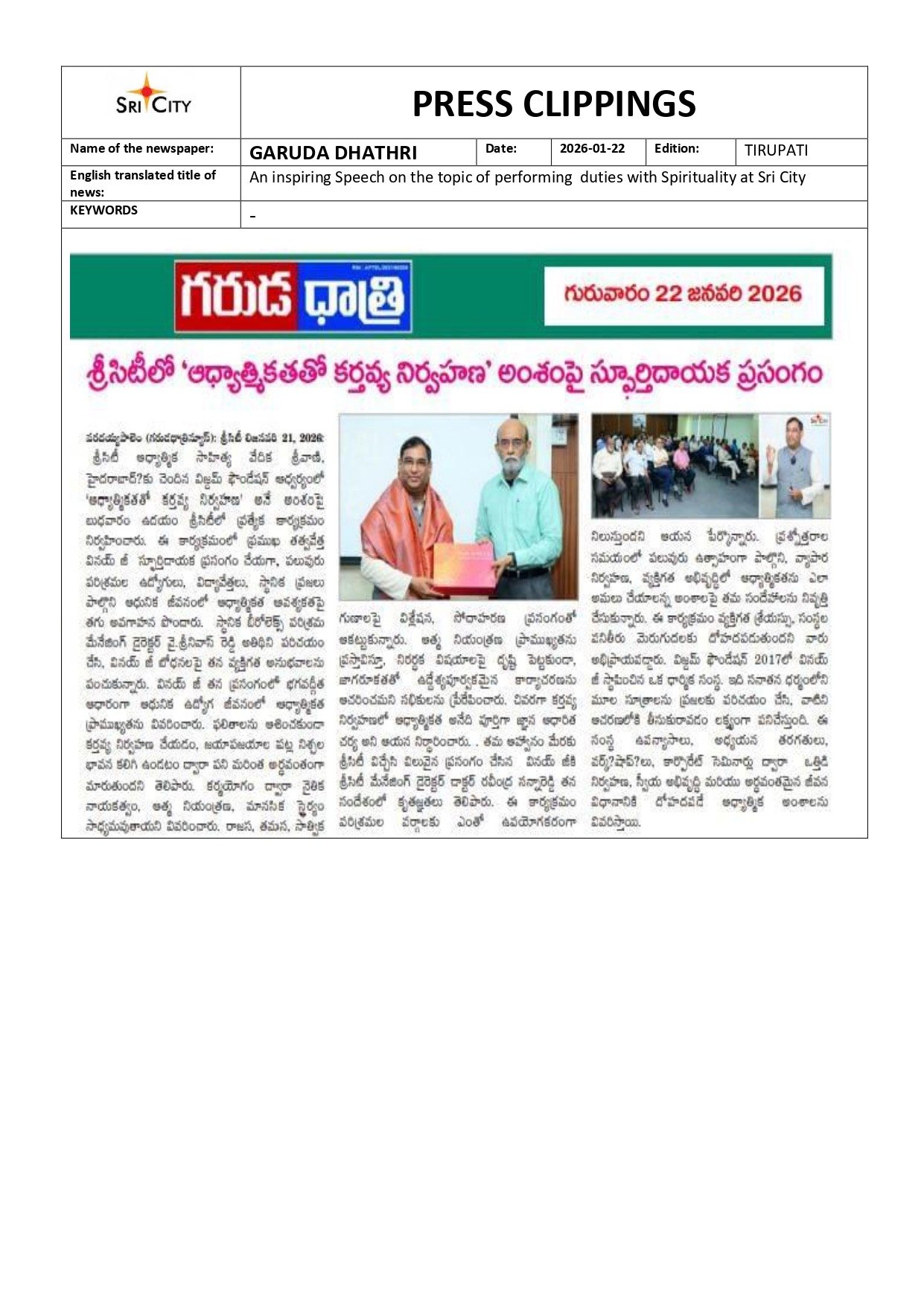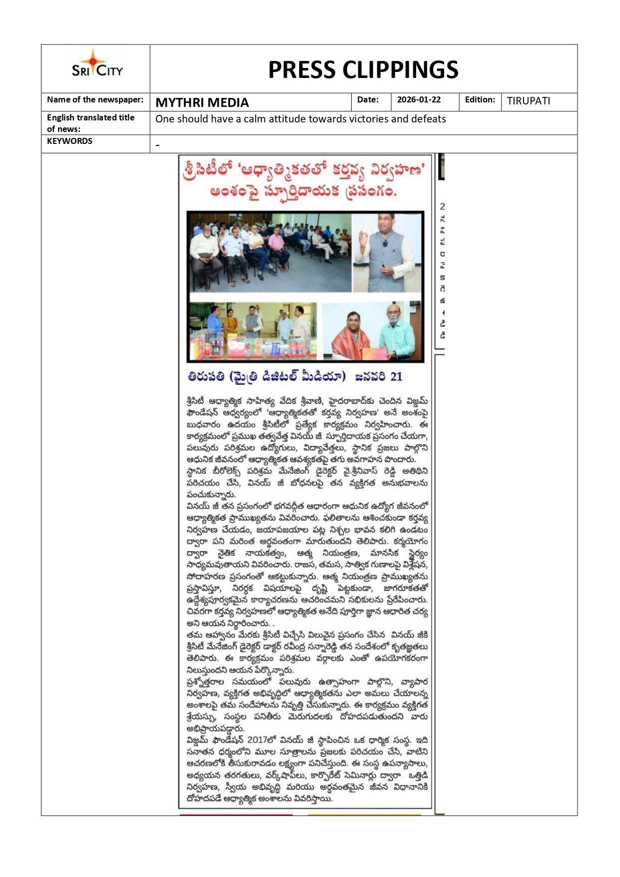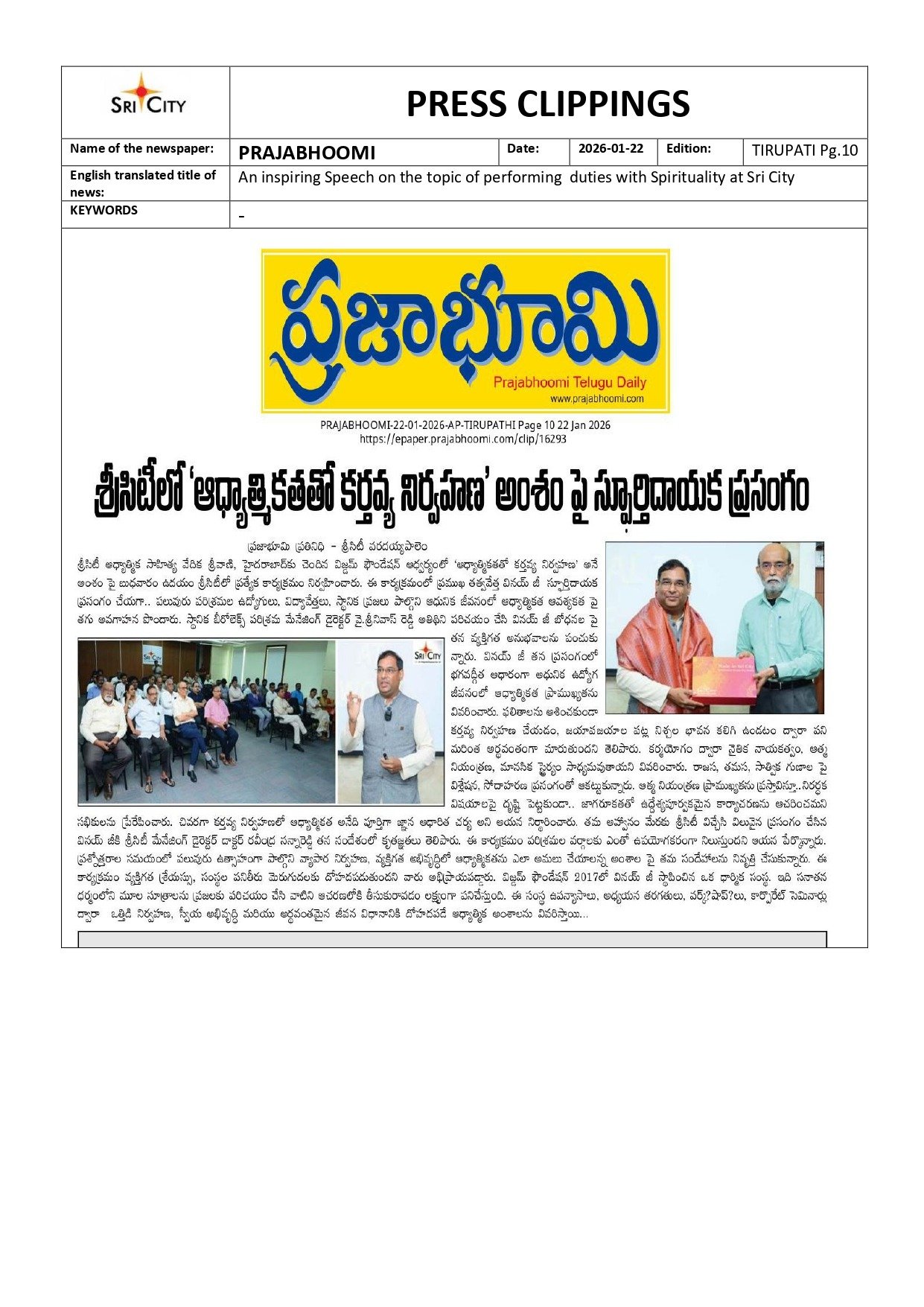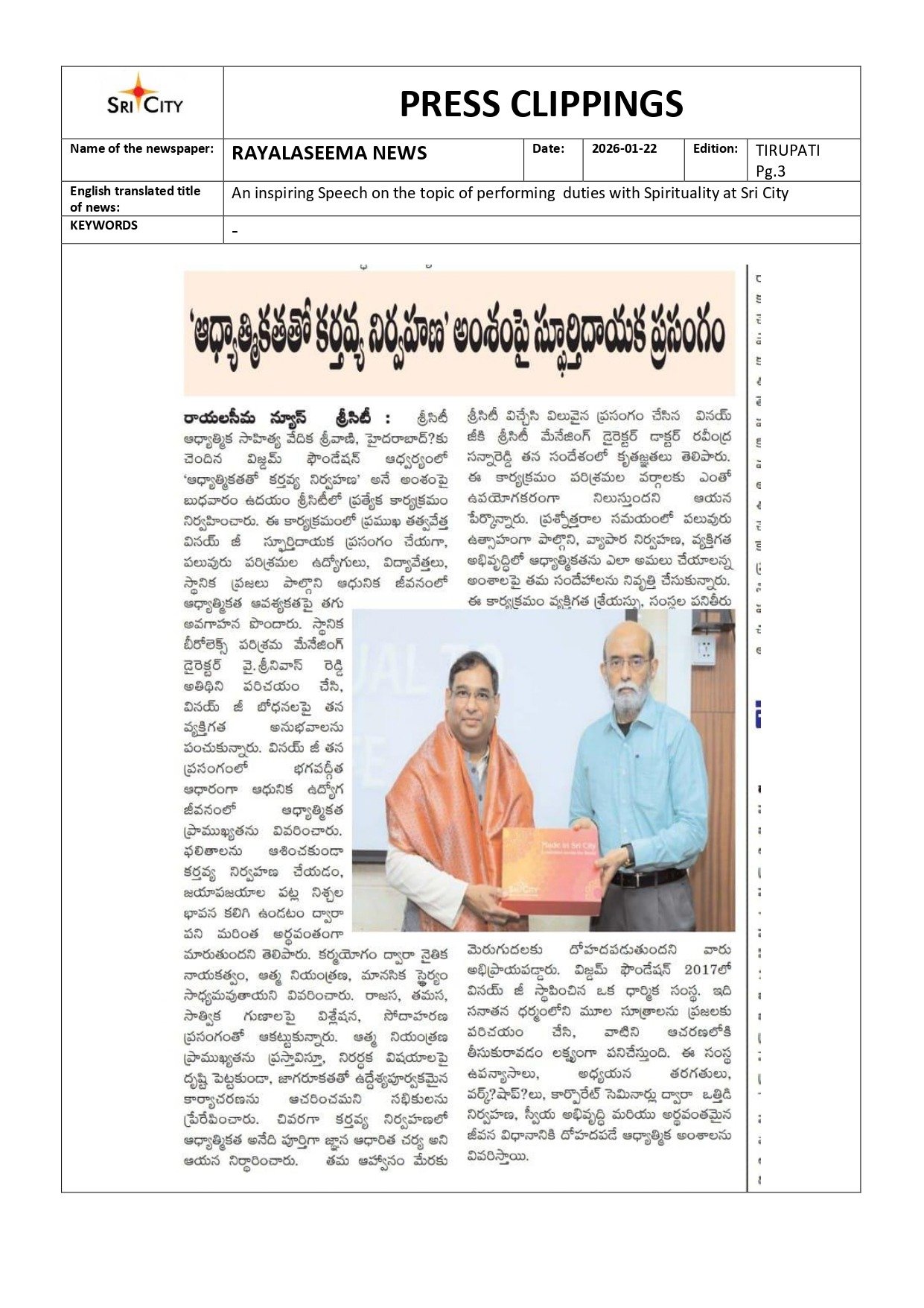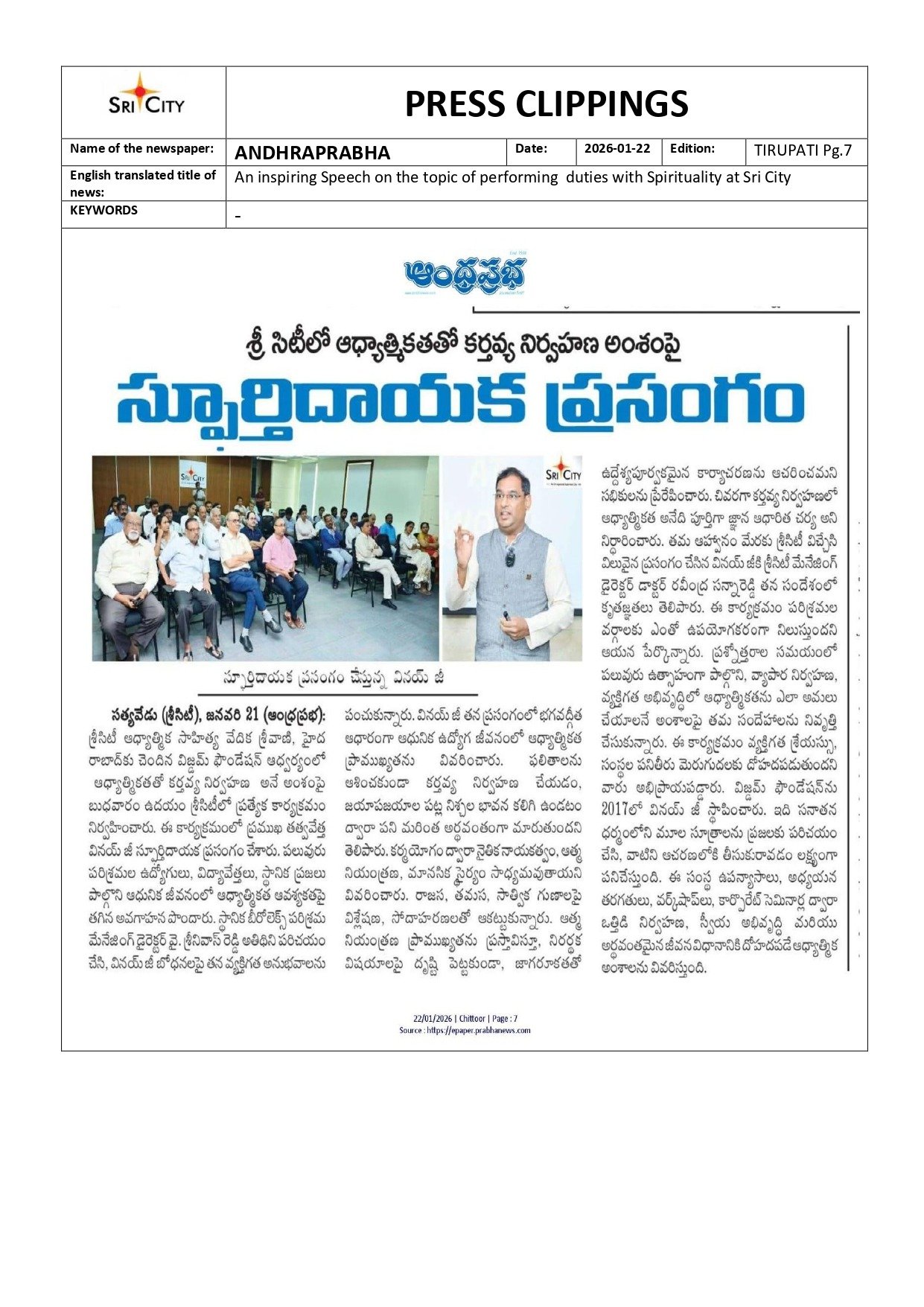 The Telangana & Andhra Pradesh Tax Bar Association – Address by Vinayji on 26th July 2025 on Spirituality at Work.