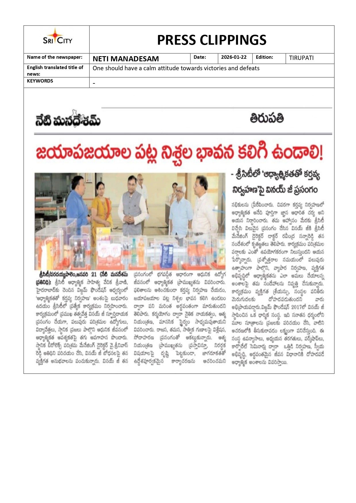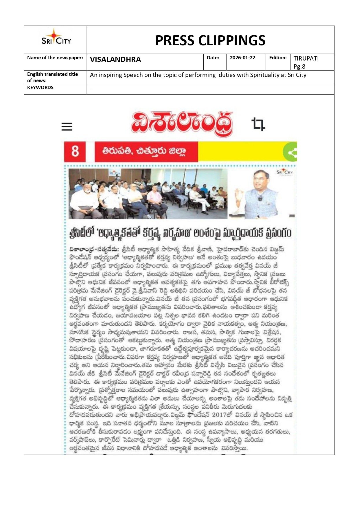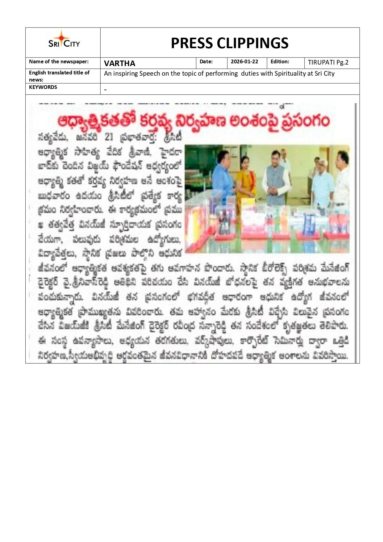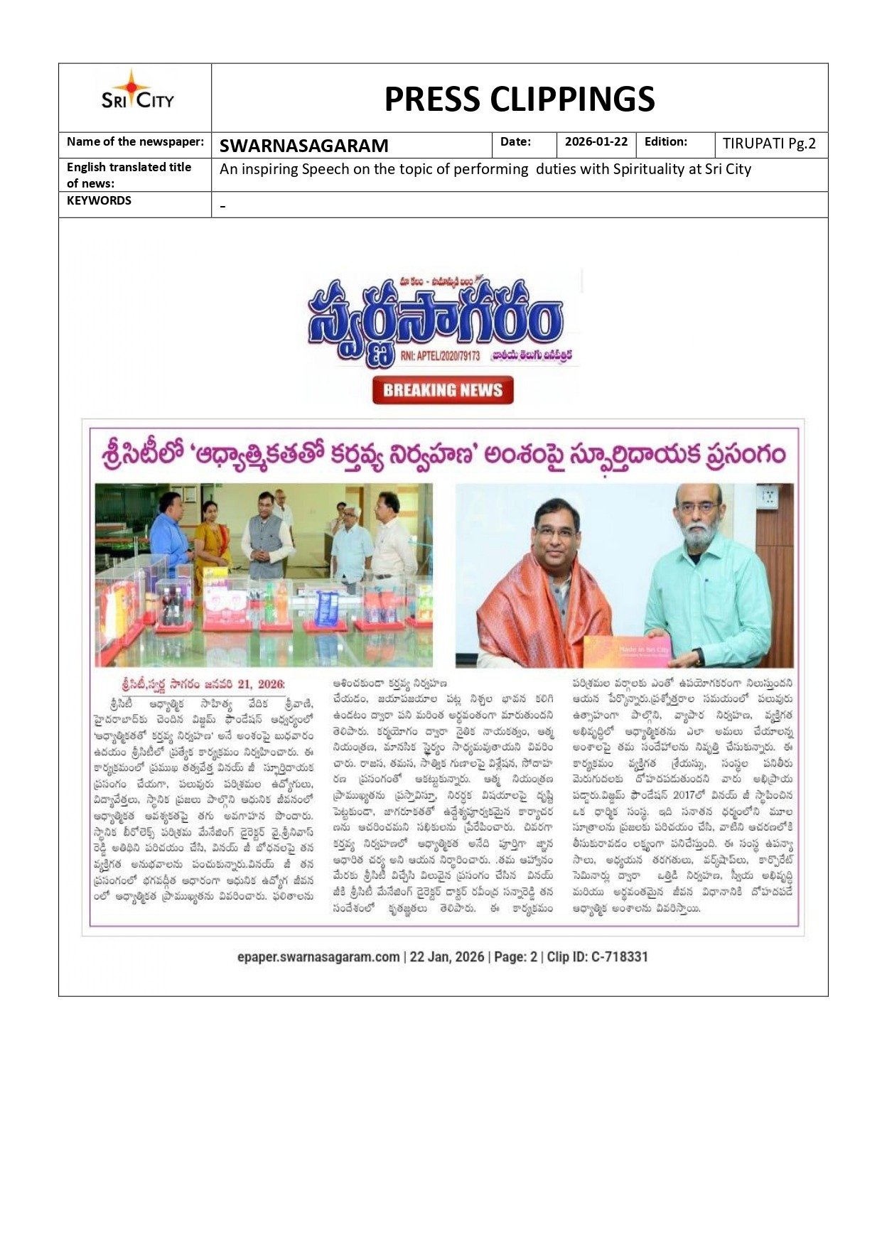 The Telangana & Andhra Pradesh Tax Bar Association – Address by Vinayji on 26th July 2025 on Spirituality at Work.
